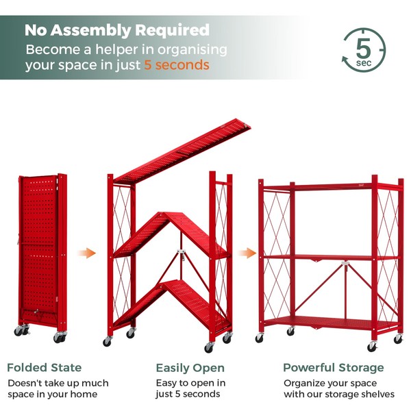 DEANIC 3 Tier Foldable Storage Shelves with Wheels, Large Capacity Shelving Unit, Freestanding Metal Wire Shelf Rack, No Assembly Organizer Rack for Garage Kitchen, Basement, Pantry(Red)