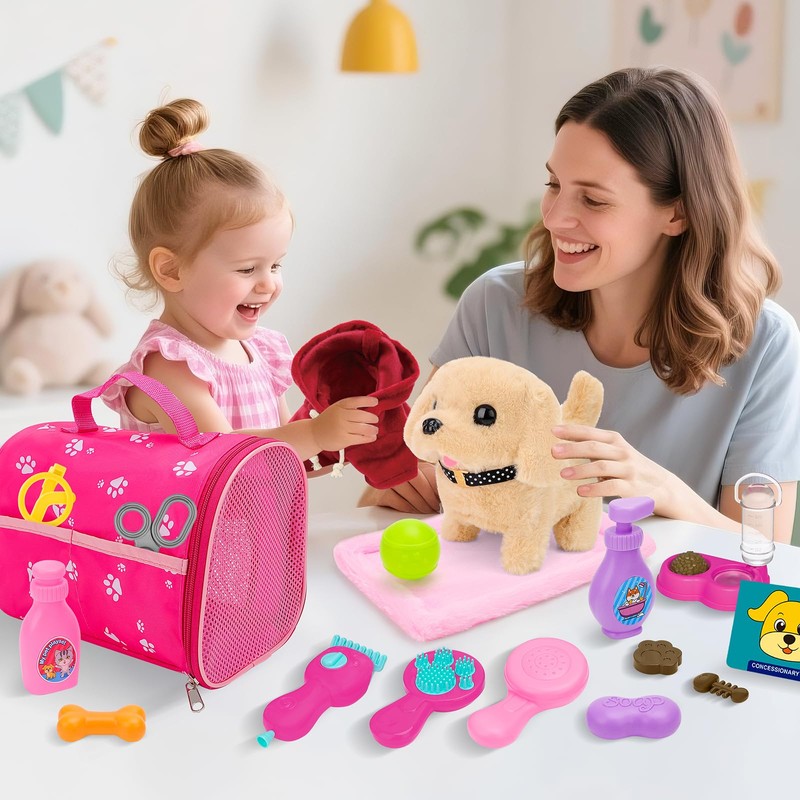 - Electronic Toy Dog Playset: The dog playset has 15+ pieces, including a plush electronic interactive pet dog, soft pet mat, dress-up clothes, pet cage, kennel, dog bowl, bone, shower gel, soap, comb, mirror, scissors, and eyeglasses for imaginative play