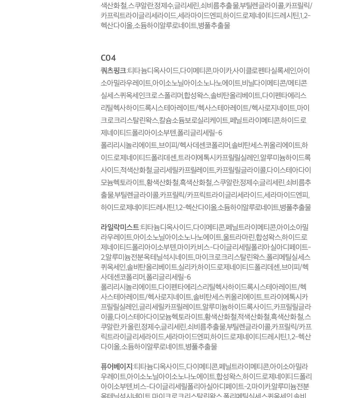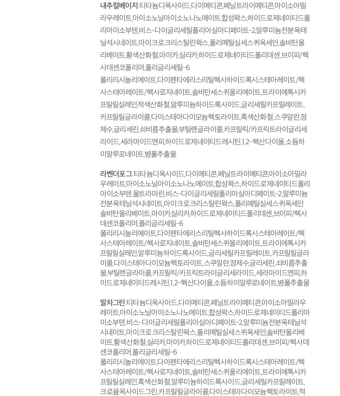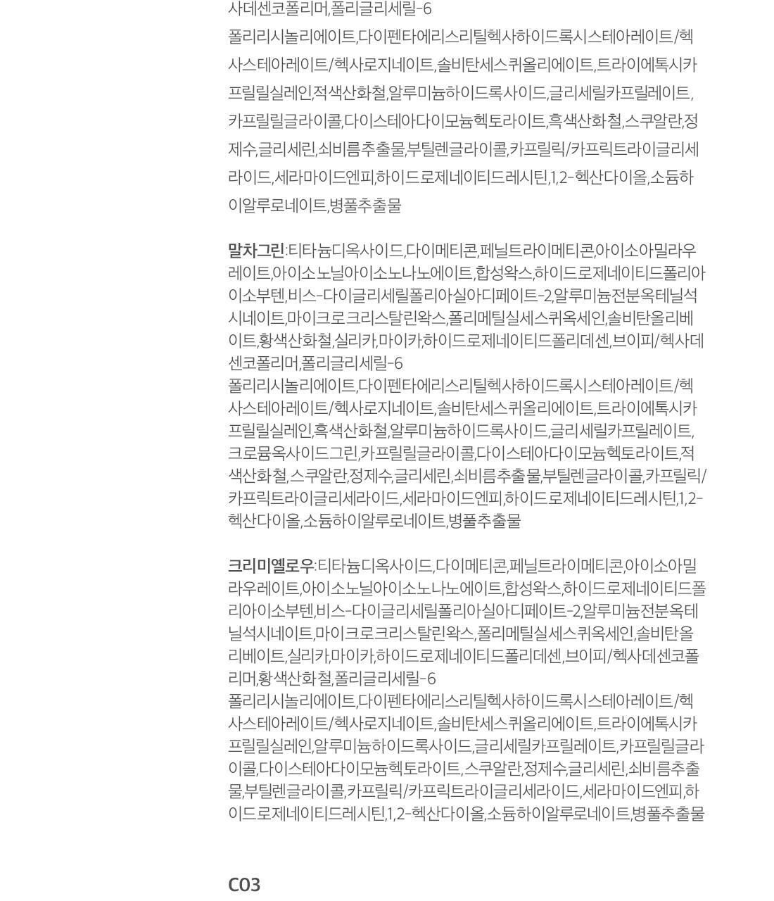 - Ingredients: *Natural Beige Titanium Dioxide,Dimethicone,Phenyl Trimethicone,Isoamyl Laurate,Isononyl Isononanoate,Synthetic Wax,Hydrogenated Polyisobutene,Bis-Diglyceryl Polyacyladipate-2,Aluminum Starch Octenylsuccinate,Microcrystalline Wax,Polymethylsilsesquioxane,Sorbitan Olivate,Iron Oxide Yellow,Mica,Silica,Hydrogenated Polydecene,VP/Hexadecene Copolymer Polyglyceryl-6 Polyricinoleate,Dipentaerythrityl Hexahydroxystearate/Hexastearate/Hexarosinate,Sorbitan Sesquioleate,Triethoxycaprylylsilane,Iron Oxide Red,Aluminum Hydroxide,Glyceryl Caprylate,Caprylyl Glycol,Disteardimonium Hectorite,Iron Oxide Black,Squalane,Water,Glycerin,Portulaca Oleracea Extract,Butylene Glycol,Caprylic/Capric Triglyceride,Ceramide NP,Hydrogenated Lecithin,1,2-Hexanediol,Sodium Hyaluronate,Centella Asiatica Extract *Matcha Green Titanium Dioxide,Dimethicone,Phenyl Trimethicone,Isoamyl Laurate,Isononyl Isononanoate,Synthetic Wax,Hydrogenated Polyisobutene,Bis-Diglyceryl Polyacyladipate-2,Aluminum Starch Octenylsuccinate,Microcrystalline Wax,Polymethylsilsesquioxane,Sorbitan Olivate,Iron Oxide Yellow,Silica,Mica,Hydrogenated Polydecene,VP/Hexadecene Copolymer,Polyglyceryl-6 Polyricinoleate,Dipentaerythrityl Hexahydroxystearate/Hexastearate/Hexarosinate,Sorbitan Sesquioleate,Triethoxycaprylylsilane,Iron Oxide Black,Aluminum Hydroxide,Glyceryl Caprylate,Chromium Oxide Greens, Caprylyl Glycol,Disteardimonium Hectorite,Iron Oxide Red,Squalane,Water,Glycerin,Portulaca Oleracea Extract,Butylene Glycol,Caprylic/Capric Triglyceride,Ceramide NP,Hydrogenated Lecithin,1,2-Hexanediol,Sodium Hyaluronate,Centella Asiatica Extract *Creamy Yellow Titanium Dioxide,Dimethicone,Phenyl Trimethicone,Isoamyl Laurate,Isononyl Isononanoate,Synthetic Wax,Hydrogenated Polyisobutene,Bis-Diglyceryl Polyacyladipate-2,Aluminum Starch Octenylsuccinate,Microcrystalline Wax,Polymethylsilsesquioxane,Sorbitan Olivate,Silica,Mica,Hydrogenated Polydecene,VP/Hexadecene Copolymer,Iron Oxide Yellow,Polyglyceryl-6 Polyricinoleate,Dipentaerythrityl Hexahydroxystearate/Hexastearate/Hexarosinate,Sorbitan Sesquioleate,Triethoxycaprylylsilane,Aluminum Hydroxide,Glyceryl Caprylate,Caprylyl Glycol,Disteardimonium Hectorite,Squalane,Water,Glycerin,Portulaca Oleracea Extract,Butylene Glycol,Caprylic/Capric Triglyceride,Ceramide NP,Hydrogenated Lecithin,1,2-Hexanediol,Sodium Hyaluronate,Centella Asiatica Extract