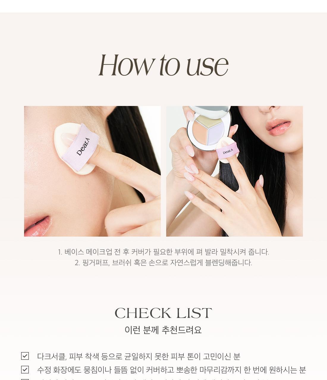 1. Apply to the necessary areas that require coverage before and after base makeup by spreading it and making it adhered. 2. Blend with your finger puff, brush, or hand.