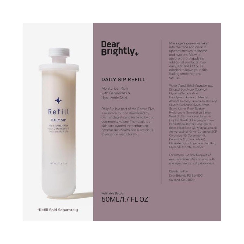 - This reusable glass bottle is designed exclusively for use with the DearBrightly Daily Sip Moisturizer refill product.