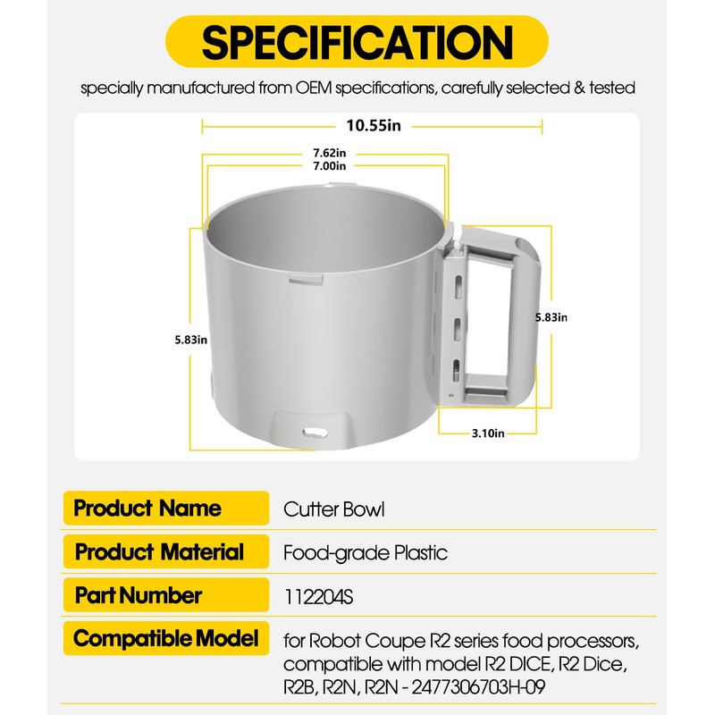 - STRONG COMPATIBILITY - 112204S Cutter Bowl is specifically designed for Robot Coupe R2 series food processors, compatible with model R2 DICE, R2 Dice, R2B, R2N, R2N - 2477306703H-09. Meet the needs of various food processors, providing versatile and broad applications. Please double check this replacement whether fits your model before purchase