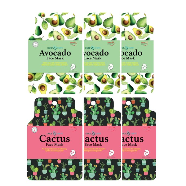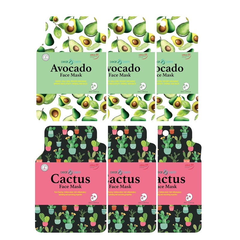 DearDerm Moisturizing Sheet Masks, Facial Mask Skincare - Soothing, Firming, Purifying, Moisture, Nurturing, Brightening, Elasticity - Avocado 3pcs and Cactus 3pcs (6 Sheets in total)