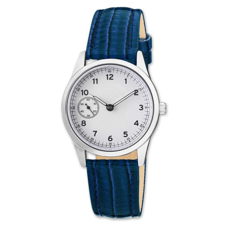 - Navy color regular length calf skin leather replacement watch strap with embossed teju lizard grain. Perfect for wrist sizes from 6.5" to 7.5" in diameter. Size at the lugs, where it connects to the watch, is 16mm wide. At the buckle the width is 14mm.
