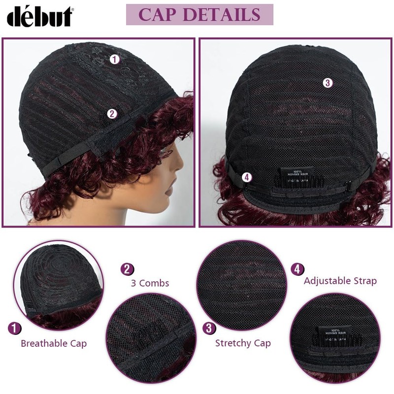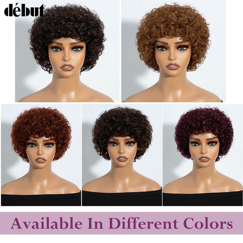 DÉBUT Short Curly Glueless Wigs 100% Human Hair Afro Curly Wigs with Bangs for Women Loose Curls Wear&Go Non Lace Front Wig (99J)
