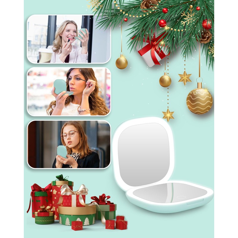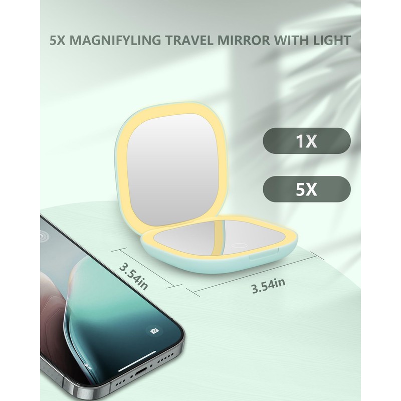 Dec.Metu Compact Mirror, 1X/5X Magnification Pocket Travel Makeup Mirror with Lights for Purse Rechargeable Small Handheld Mirror for Gift Green