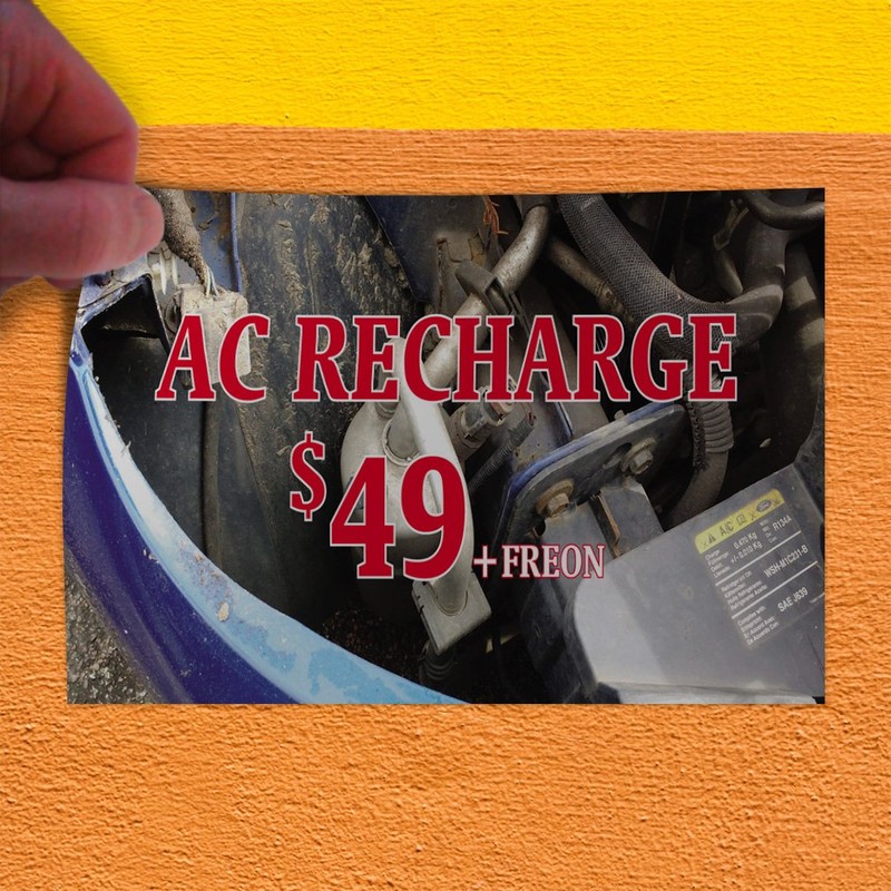 The text reads ac recharge $ 49 + freon. Also available in 7 different sizes, you will always find the perfect fit for you!
