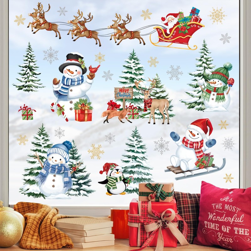 This window cling is a great decoration for christmas themed home or party, which includes snowman, christmas tree, pine tree, elk, santa claus, reindeer and snowflakes