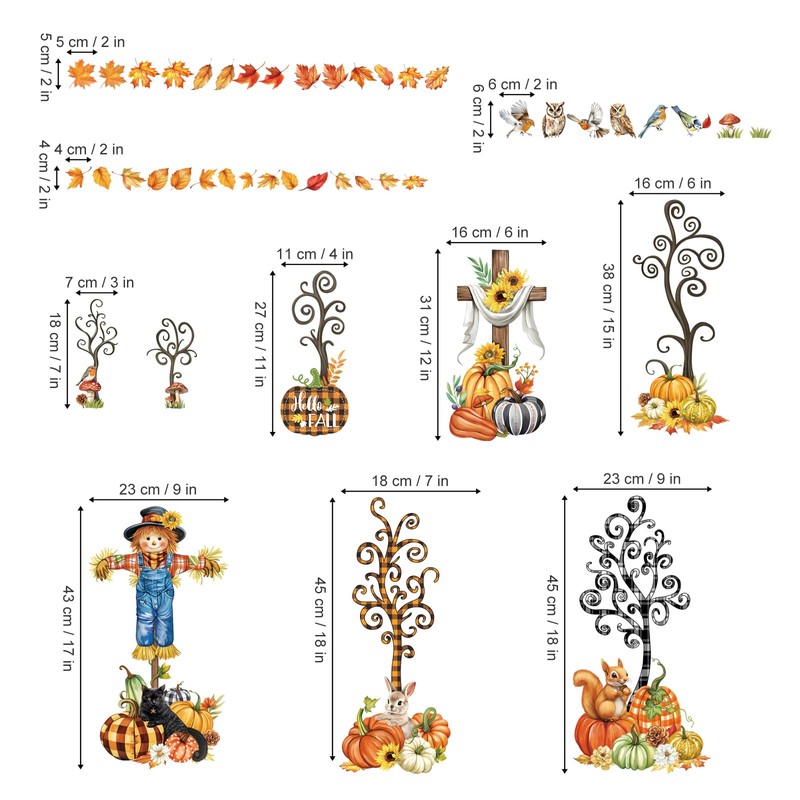 This window cling is a great decoration for window,which includes maple leaves, scarecrows, pumpkins, rabbits, owls, squirrels, cats.