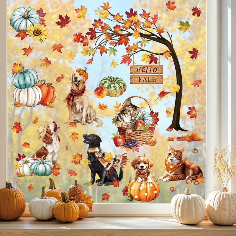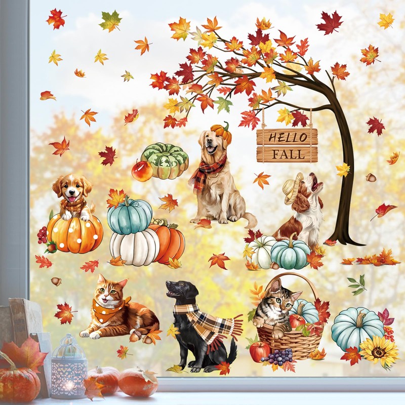 decalmile Hello Fall Thanksgiving Pumpkin Window Clings Dog Cat Autumn Maple ...
