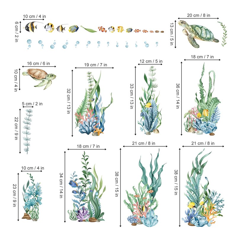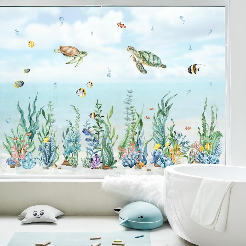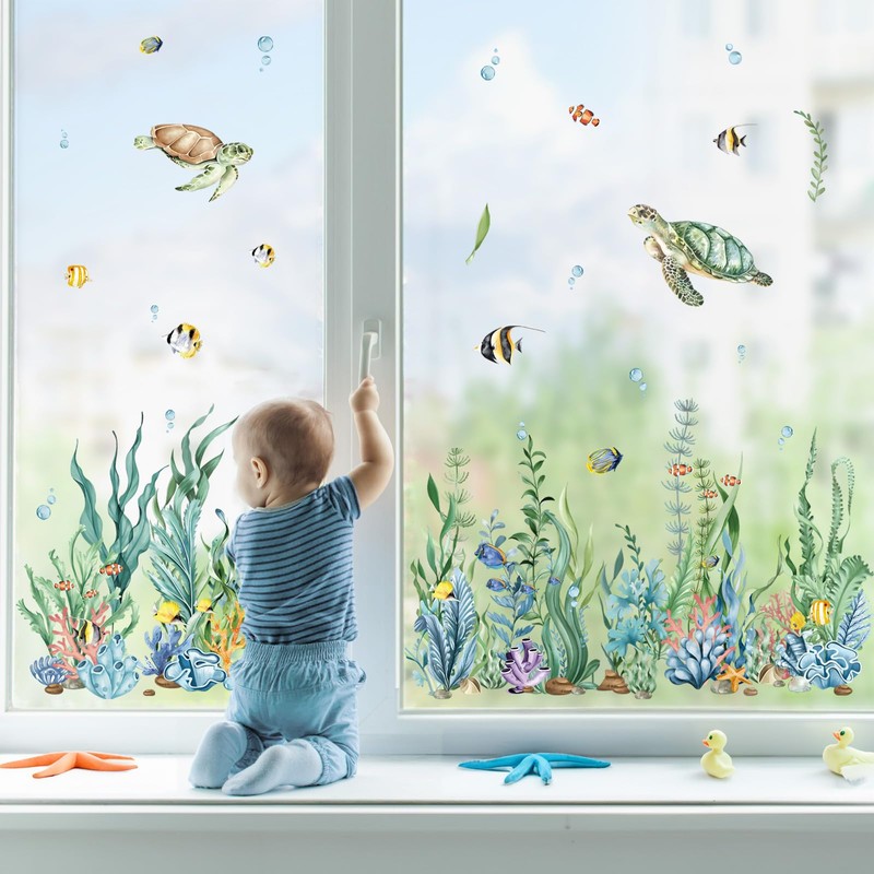 This window cling is a great decoration for window, which includes under the sea seaweed, fish, and turtle.