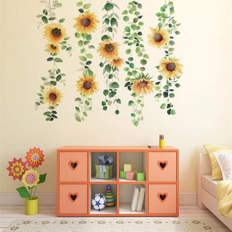 Decalplanet Sunflower Wall Art Stickers Floral Hanging Vine Green Plants Wall Decals for Girls Bedroom Living Room Home Decor