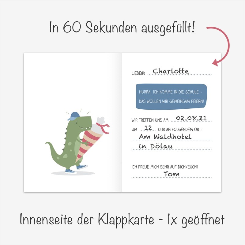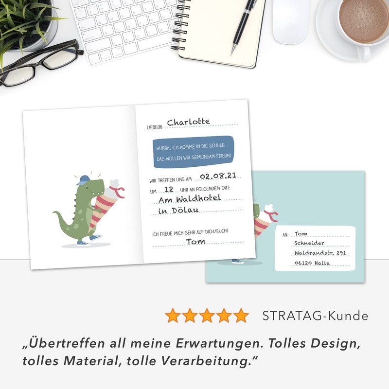 - Sustainable material - The invitation cards with dinosaur T-Rex motif and sugar bag are lovingly made 100% in Germany. You and your guests will feel the difference to picture paper in your fingertips.