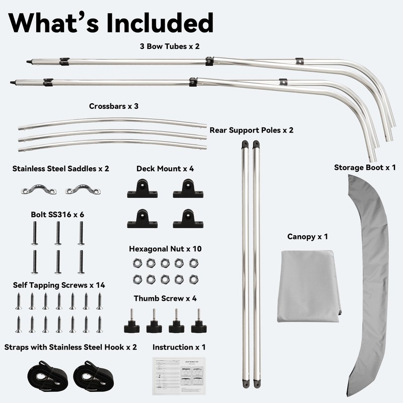 - Simple Installation and Storage: The boat canopy comes with 2 rear support poles and 2 front straps which ensure stability & fast fold. Additionally, it includes a zippered storage boot that is dust and waterproof, ensuring the safety of your bimini top when not in use.