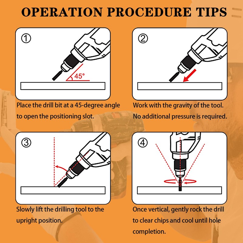 When using the drill bits, hold them at a 45-degree angle to the surface and slowly bring them to an upright position while moving in a circular motion.