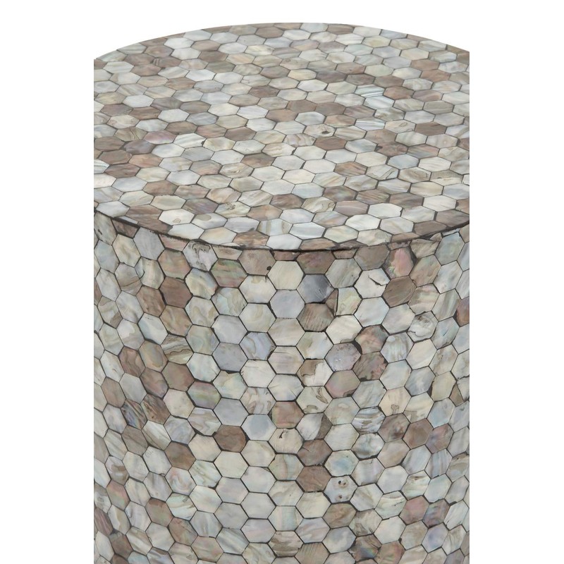 This dimensional round end table is beautifully handmade in Vietnam with freshwater pearl mussel shells coating the cylindrical body. Each of the multi-colored, opalescent beige, taupe, pearl, and blue-gray mussel shells are cut into hexagons and placed in a honeycomb pattern. Suiting both contemporary and coastal styles, the neutral tones of the pearly shells of this small side table work with almost any color palette while providing reflective, luminous dimension.