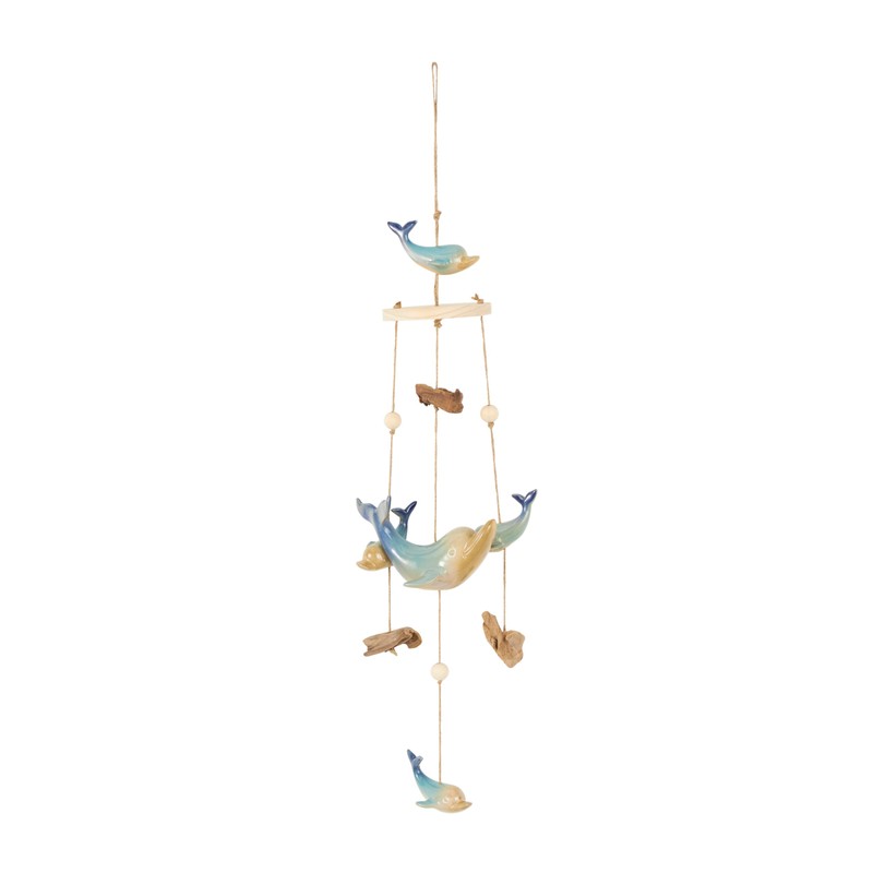 - WHALE ASYMMETRICAL WINDCHIME: A stunning arrangement of hanging whales with dangling driftwood pieces and wooden ball accents, this coastal windchime invokes beachside tranquility