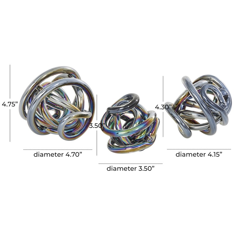 Deco 79 Glass Abstract Handmade Decorative Sculpture Iridescent Knotted Ball Home Decor Statues, Set of 3 Accent Figurines 5", 4", 4"W, Dark Gray