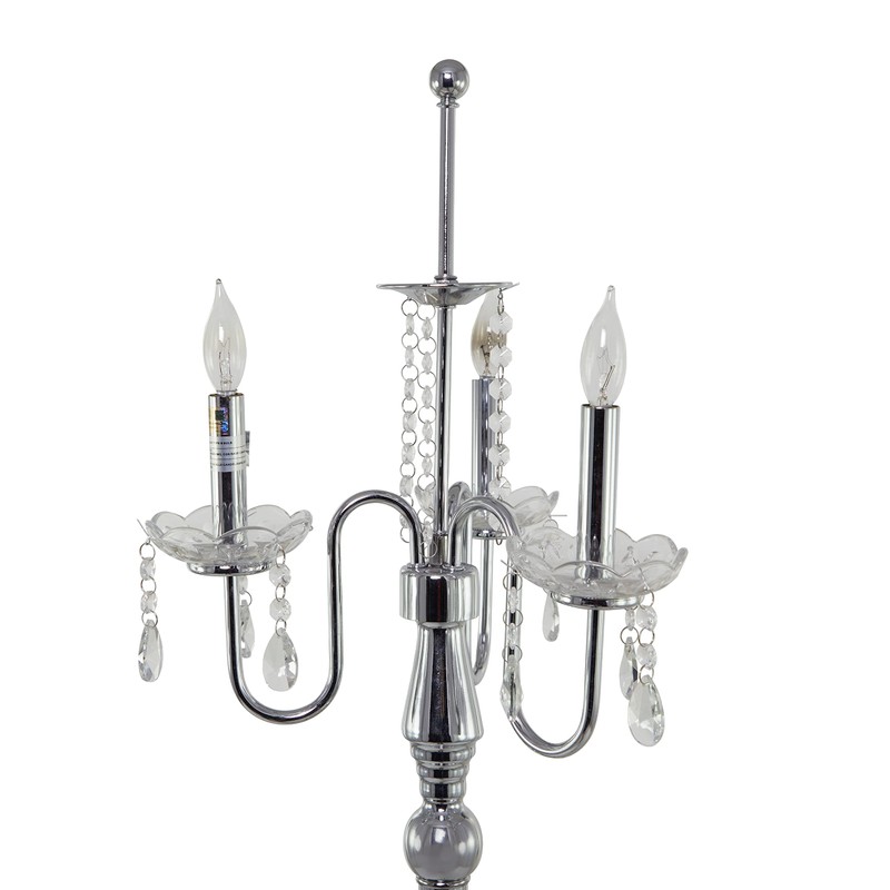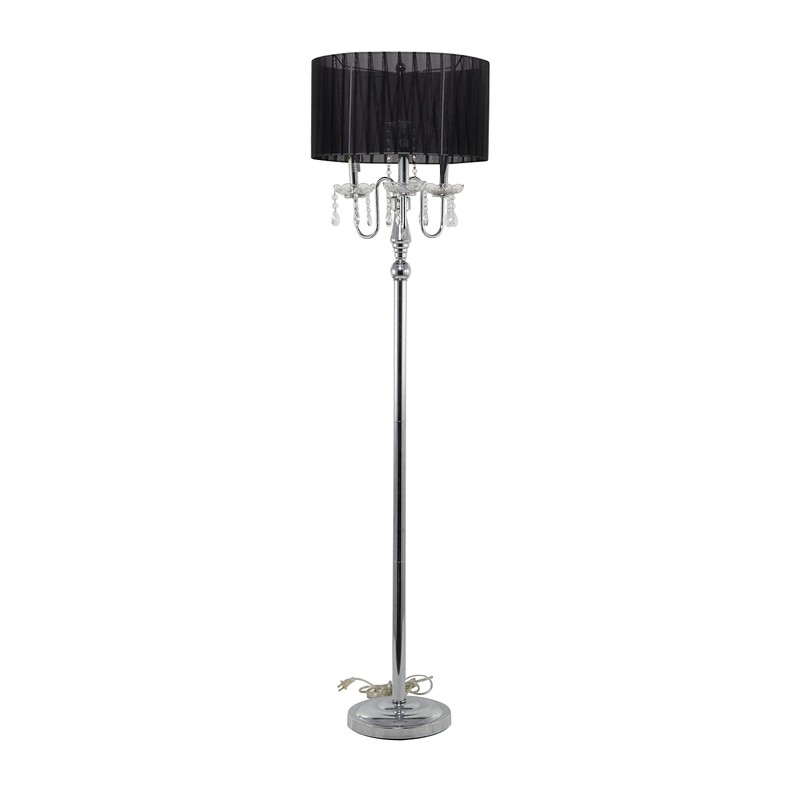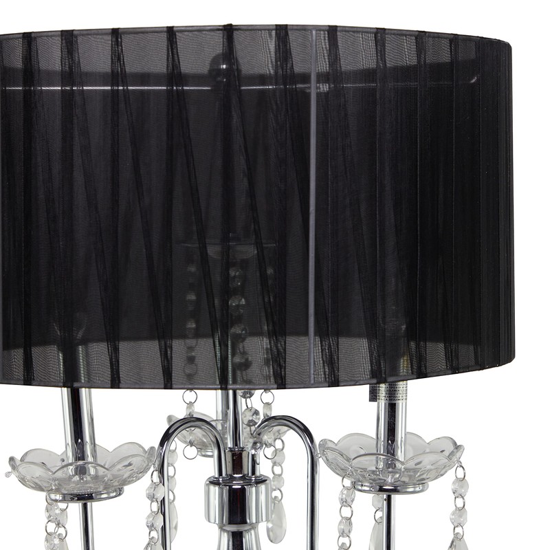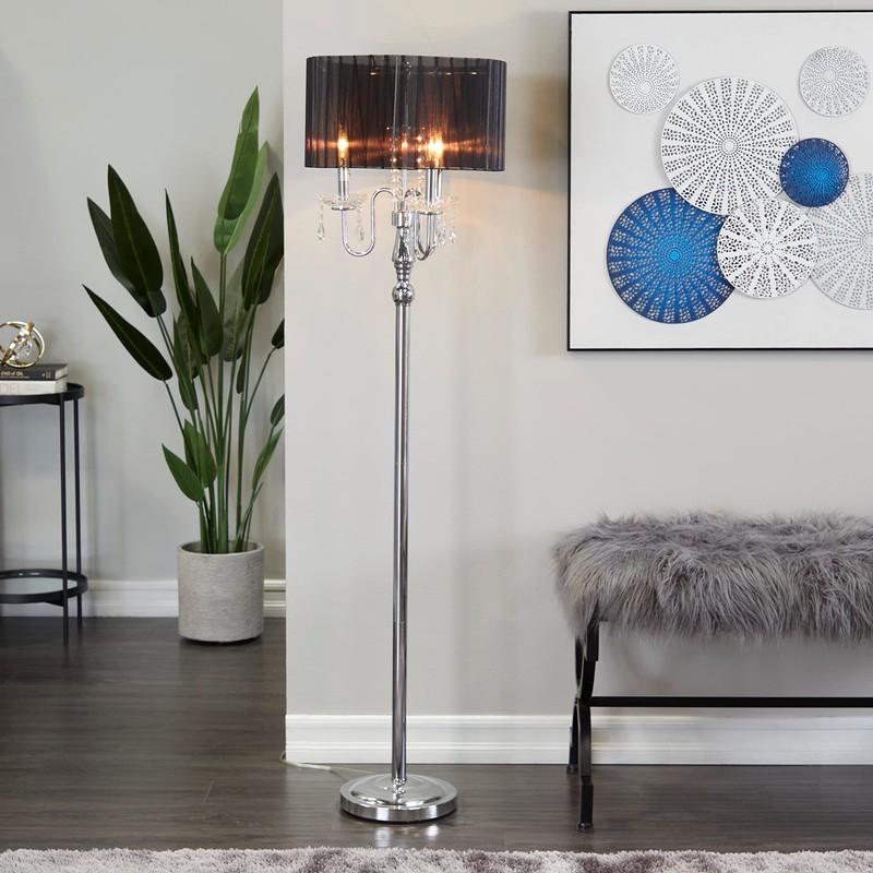 - ROUND FLOOR LAMP Glam accent floor lamp that comes with a black round ribbed fabric shade and a silver candelabra-inspired body with candle-like led bulbs, curvy candle plates, and dangling decoration