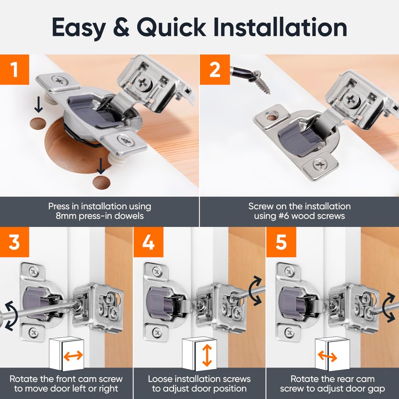 - Easy DIY Install with Perfect Fit – Install these kitchen cabinet hinges in minutes. Pre-drilled holes align easily, and 3-way adjustability lets you fine-tune the fit for straight, flush cabinet doors that look professionally installed.