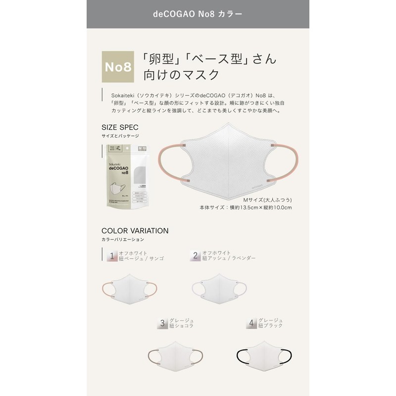 - ★ A Wide Variety of Colors★ Sokaiteki's "deCOGAO" uses nuanced colors that are close to the skin to match a variety of skin tones, so you can change your daily makeup. In addition, it is not only a simple mask of the same color, but also a playful bi-color mask for your entire body. In addition, there are also limited colors that are easy to use to match the season