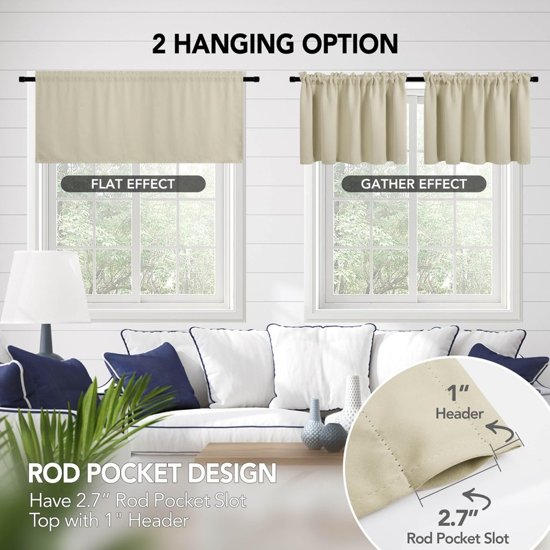 • BASIC INFORMATION - Bathroom window curtains 2 panels set. Each panel 30 x 24 inch long. Dual rod pocket design - Have 2.7" rod pocket slot, top with 1" header. Recommend use curtain rods with 1" OD.