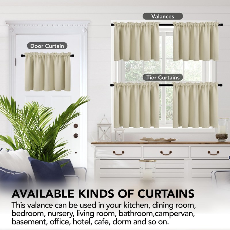 • FUNCTION CURTAINS - Deconovo black blackout tier curtains are ideal for bathroom, kitchen, cafe, restaurant, entrance door curtain, doorways, RVs, nursery, basement, kids room, laundry room, cupboard, bedroom window, living room ,small half window, valances and sliding curtains under cabinet.
