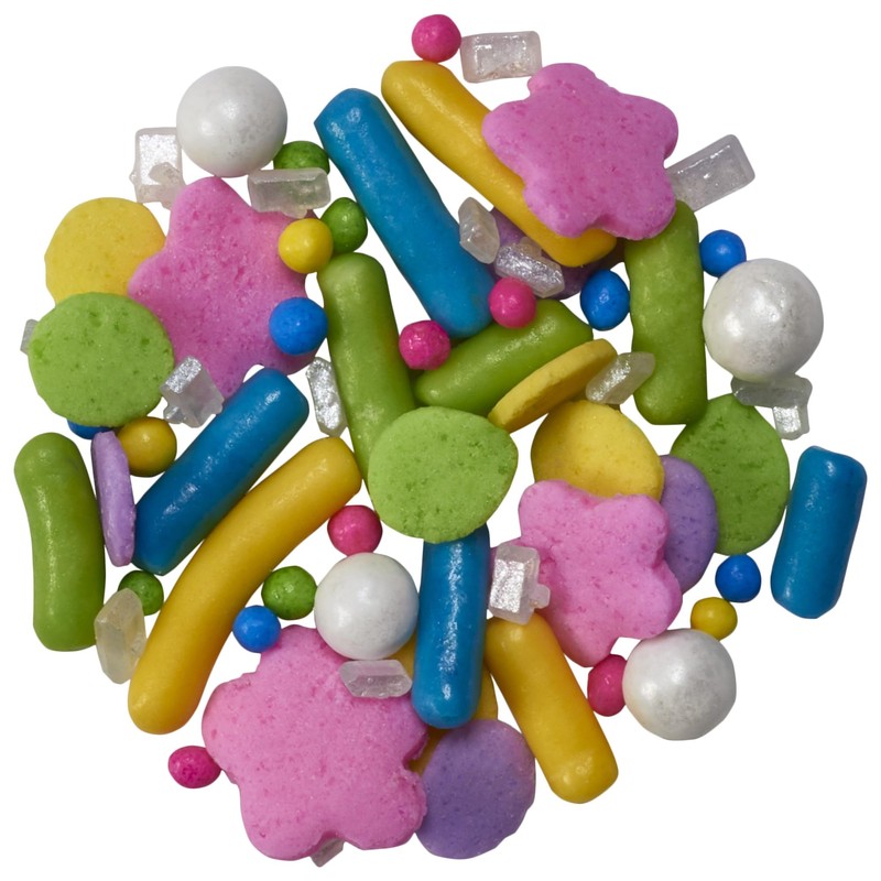 - VERSATILE SPRINKLE MIX - These fancy sprinkles add vibrant color and texture to cakes, cookies, cupcakes and other baked goods as well as ice cream and confections. Includes pink flower shapes, white non-pareil, and yellow, blue, green, and lilac sprinkles, perfect for Easter and Spring celebrations.
