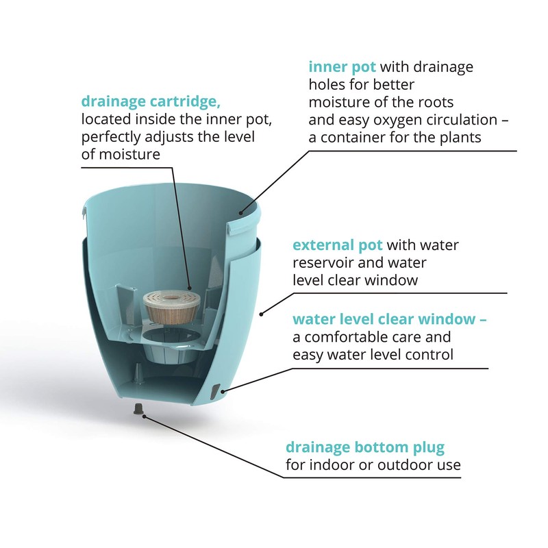 Made of plastic, DecoPots pots are strong, durable and reusable, year after year. All self-watering planters include a large built-in reservoir which draws water to the roots for up to 4 weeks and prevents them from rotting by allowing an easy oxygen circulation. DecoPots pots are great for an outdoor garden, balcony, indoor decoration, greening projects etc.