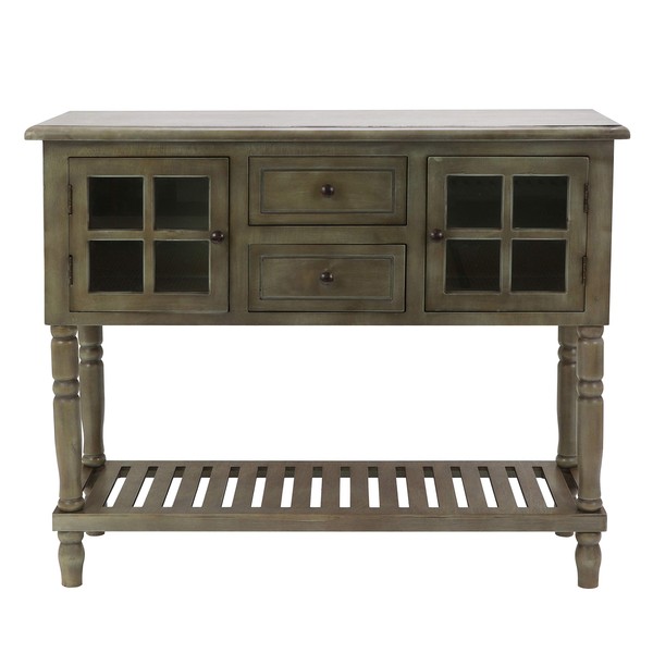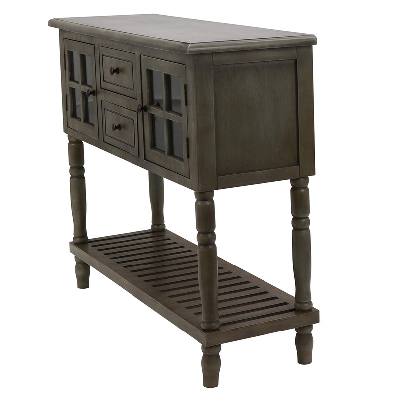 Traditional design and timeless character are the building blocks upon which the Morgan console table was designed. The quintessential transitional table that blends classic styling, modern updates, versatility and function. Two drawers provide an out of sight storage Place for unsightly clutter. Stylishly house belongings in the two cabinets, each featuring a glass window frame Door that adds charm to your living space. A slatted shelf expands your storage capability. A versatile piece that can be used as an entryway table, living room accent table or in a dining room as a buffet server. Measures 42x14x34. 25 constructed of wood.