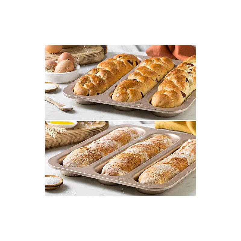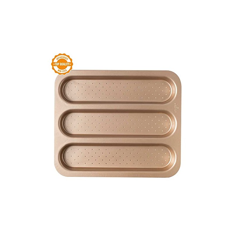 - Contents - At home, you will receive a Gold Line mould for baking fragrant baguettes with three cavities, 34.3 x 7.8 x 3 cm, made of durable non-stick metal that allows you to easily remove your bread without damaging it.