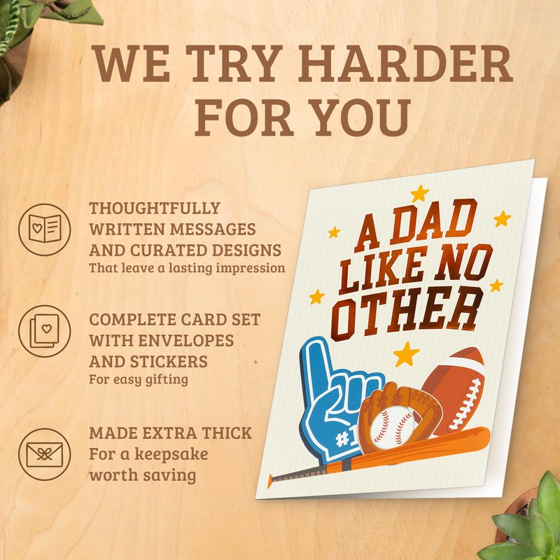 • WE JUST WANNA MAKE YOU SMILE - Your happiness is our unwavering priority. If you ever find yourself less than delighted with your happy Fathers Day cards and Fathers Day cards assortment, simply reach out, and it will be made right. Buy with confidence and don't miss out on this well-designed father's day card pack and generic Fathers Day cards.