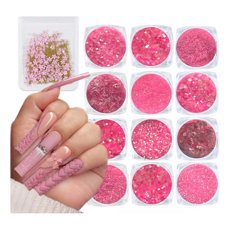 Decoracion De Uña Gliter Flake Color Rosa Coquette Y Flores