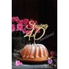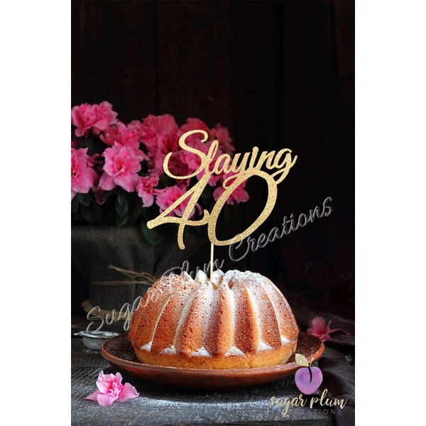 La decoración para tartas Slaying 40 está hecha con cartulina dorada con purpurina en un lado. La parte posterior de la decoración para tarta es de color blanco. El material es papel de purpurina. La decoración mide 15,24 cm de ancho y 11,43 cm de altura. Se fija a un palo de 15 cm.