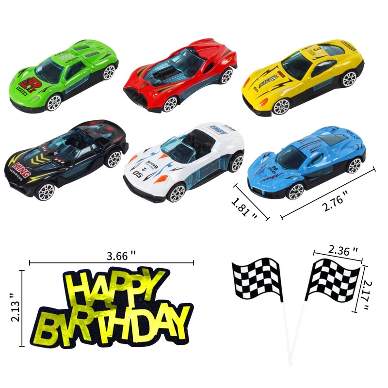 - 【Los productos incluyen】6 coches de carreras, 1 decoración para tartas "Happy Birthday", 2 adornos de bandera.