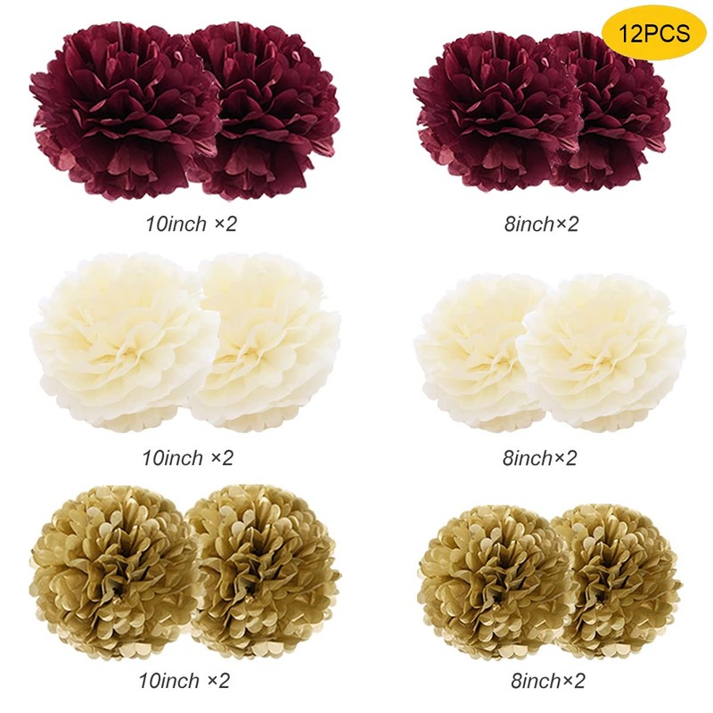 - Pack of 12 pcs flower pom poms 10inch:(Cream+2*burgundy+2*gold+2*)8inch:(Cream+2*burgundy+2*gold+2*)Each pom comes with one yard thin white ribbon for hanging. Ships flat, hanging string attached bridal shower decorations/birthday party decorations.With a beautiful, burgundy