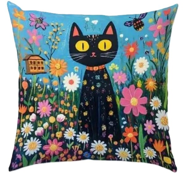 - VIBRANT DESIGN: Charming cat-themed decorative cushion cover featuring a black cat surrounded by colourful flowers on a bright blue background, perfect for adding whimsy to any room