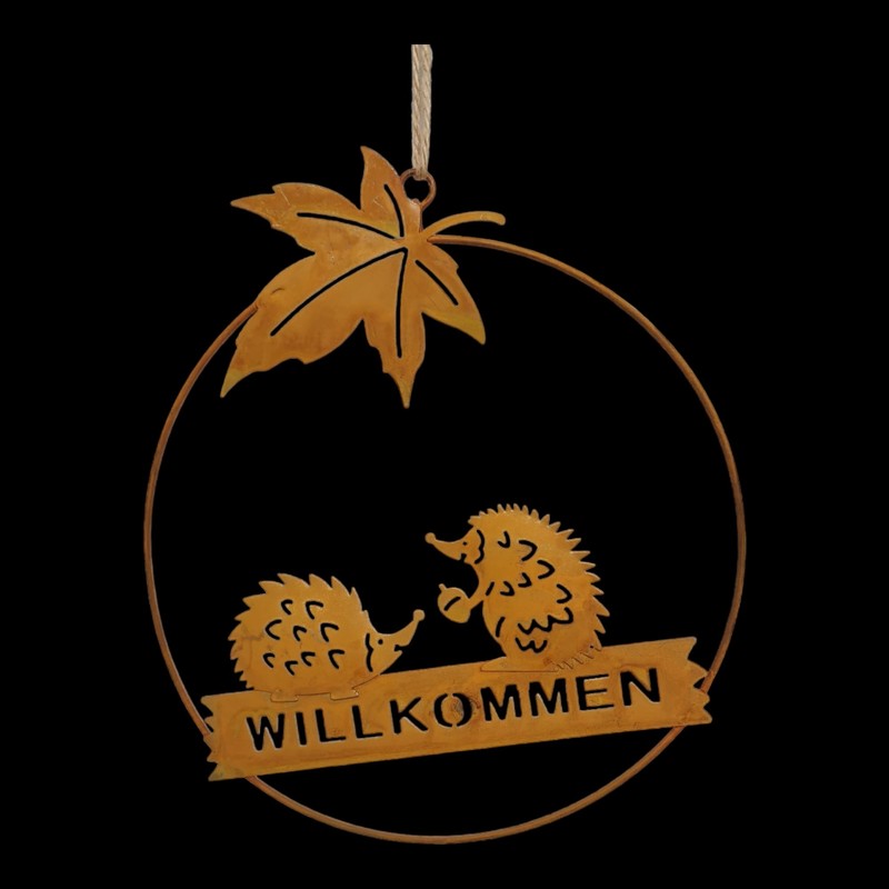- Very beautiful decorative hedgehog hanger with maple leaf and lettering "Willkommen", as a wall decoration, door decoration, window decoration or garden decoration in late summer and autumn