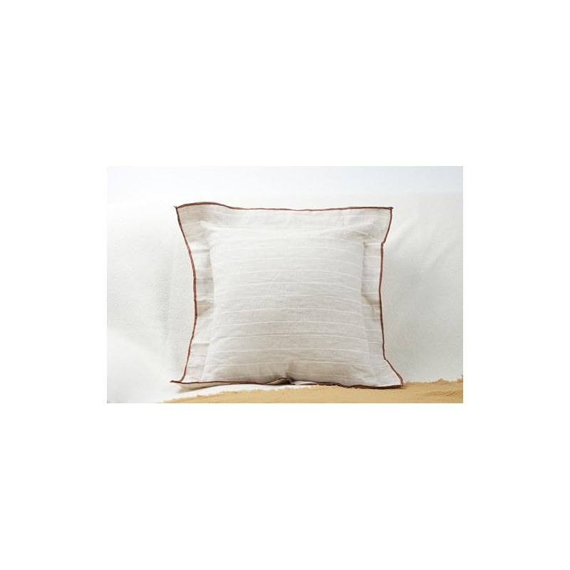 Decorative Linen Cushion Cover with Brown Piping, White Striped Pattern