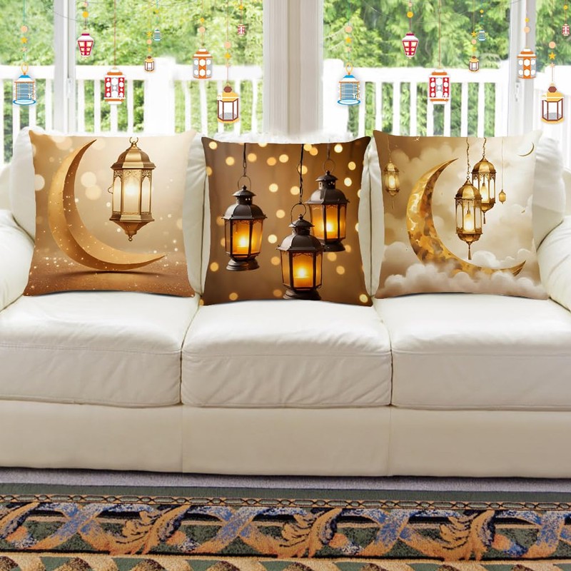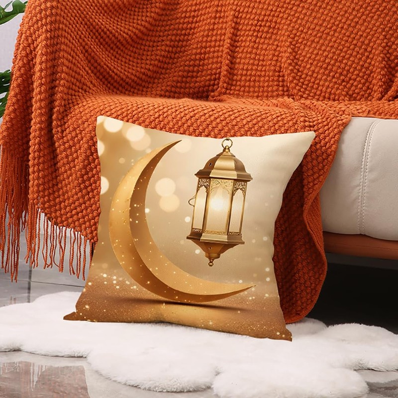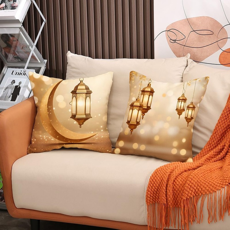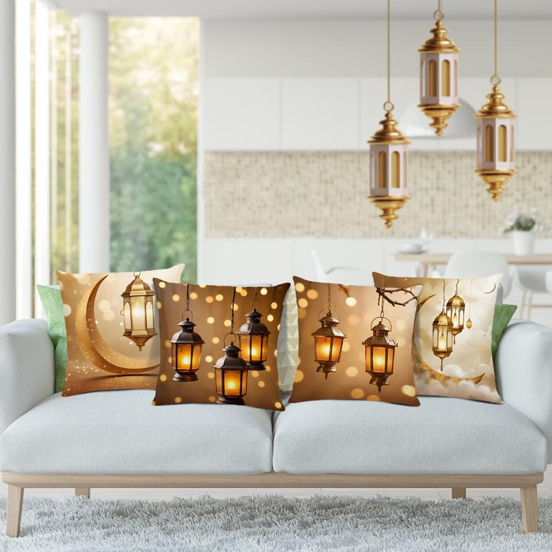 - Stylish Design Set: Set of 4 pillow cases with Islamic lunar and lantern motifs in sophisticated golden schemes.