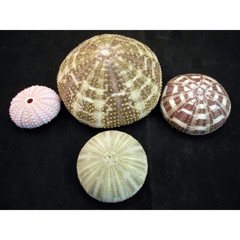 Sea Urchin Sampler One Sputnik Sea Urchin (1 1/2"-2"), One Natural Pink Sea Urchin (1"-1 1/2"); One Natural Green Sea Urchin (2"), One Natural Alfonso Sea Urchin (3"). ALL SIZES ARE APPROXIMATE. Beautiful Beach Themed Wedding Decorations. Perfect for all kinds of crafts, Beach Cottage and Nautical Decorations. Note: Our seashells are 100% natural and can vary slightly in color and markings.
