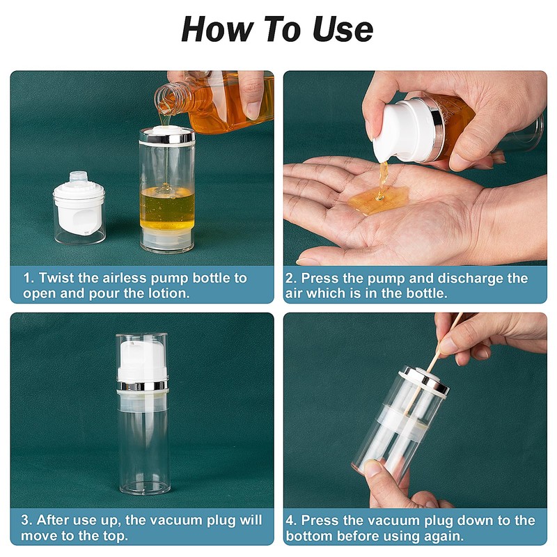 - How to Use: Step 1: Twist the airless pump bottle open and pour in the lotion. Step 2: Press the pump to release the air inside the bottle. Step 3: As the product is used, the plug will rise to the top. Step 4: Before reuse, push the plug back to the bottom. Step 5: Refill with lotion and enjoy again.