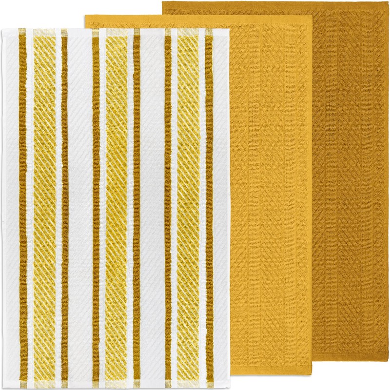 DecorRack 3 Kitchen Towels, 16 x 27 Inch Dish Cloths for Kitchen and Countertop Use, Yellow Set (1 Striped, 2 Solid)