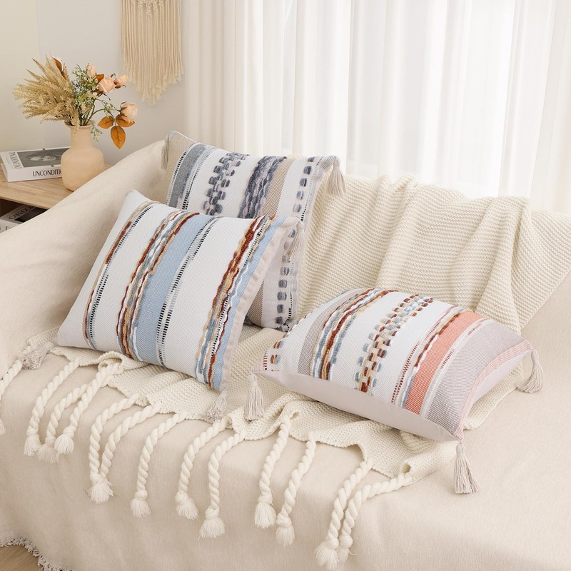 - Modern Boho Design: The couch pillow covers with a unique design will give your home a modern boho look. The chenille stripes in multi-color feel soft and the woven part makes the decorative pillow covers look textured. The hand-made tassels are cute and not easy to fall off