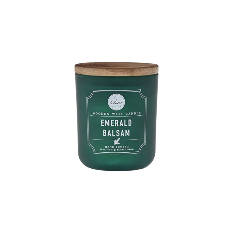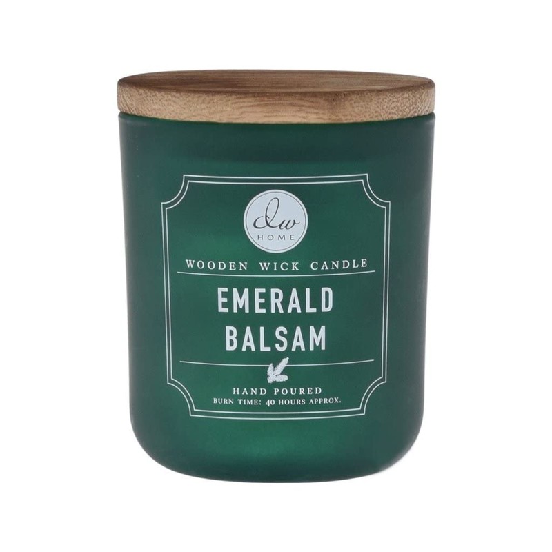 DW Home Holiday Scented Collection with wooden wicks. Festive glass jars with wooden lids. Emerald Balsam scent: Fresh-cut balsam fir, frosted fraser and cypress enhanced with citrus-splashed sage, ambered woods and a touch of crisp winter holly.