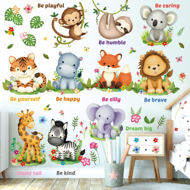 DECOWALL DS12-8074 Jungle Animal Wall Decals Removable Woodland Safari Animal Wall Sticker with Inspirational Quotes for Baby Boys Girls Infant Children Kids Nursery Bedroom Classroom Playroom