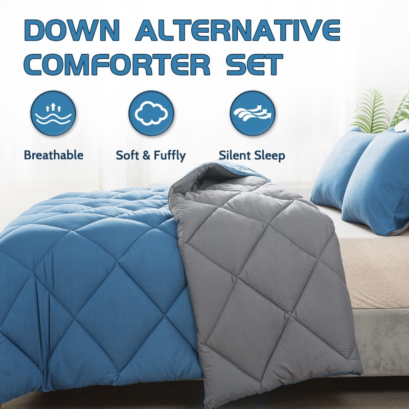 - HIGH QUALITY : Our grayish blue and grey down alternative comforter is made of 100% polyester and overfilled with premium microfiber which is soft, breathable and good for all season. Provides you a noiseless comfortable sleep.