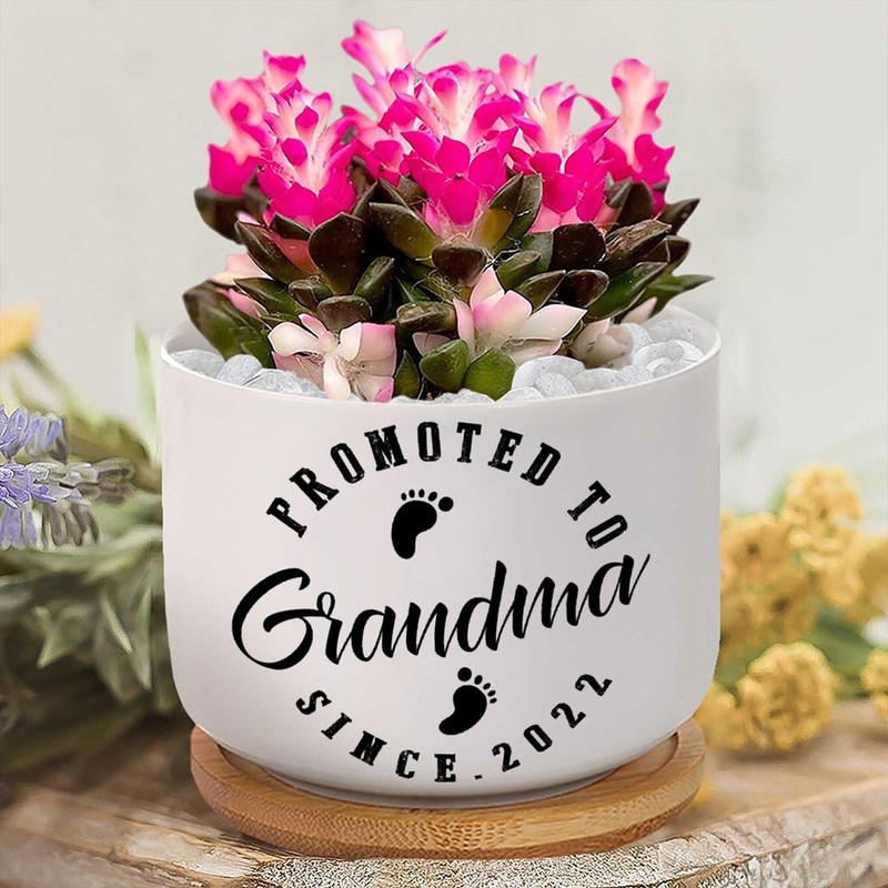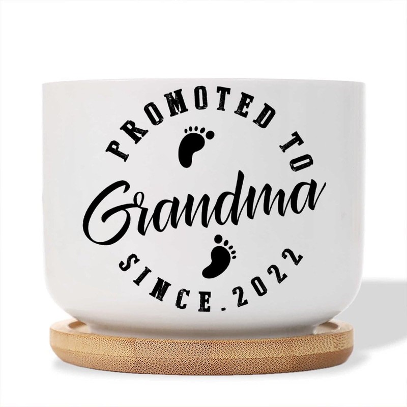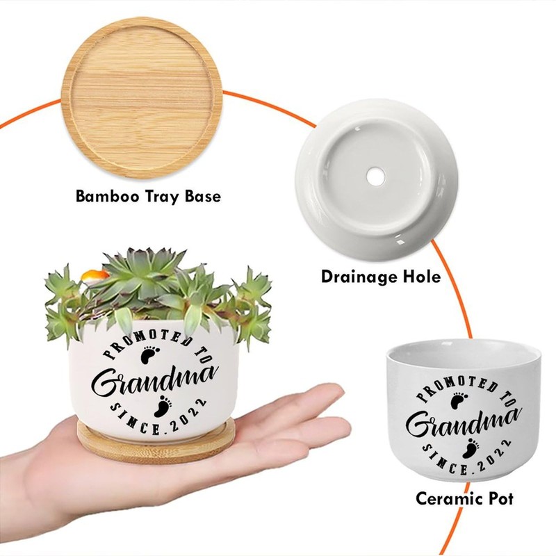 DecStic Promoted to Grandma Planter Ceramic Lettering Saying Round Flower Pots with Drainage Holes and Bamboo Tray Pot for Home Desktop Office Windowsill
