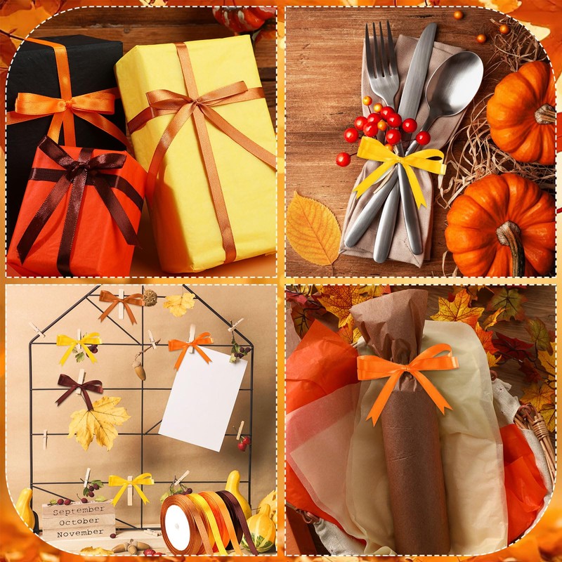 - Fall Decoration Ribbon: Fall satin ribbons can dress up your autumn Thanksgiving party well, bring surprises to your gifts, and bring more joy to your DIY crafts. Catering to the color matching of autumn, Thanksgiving ribbon can meet your decoration needs throughout the season