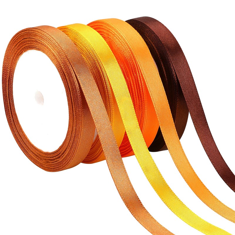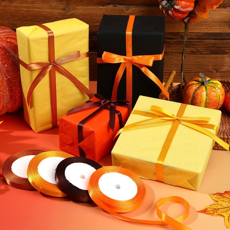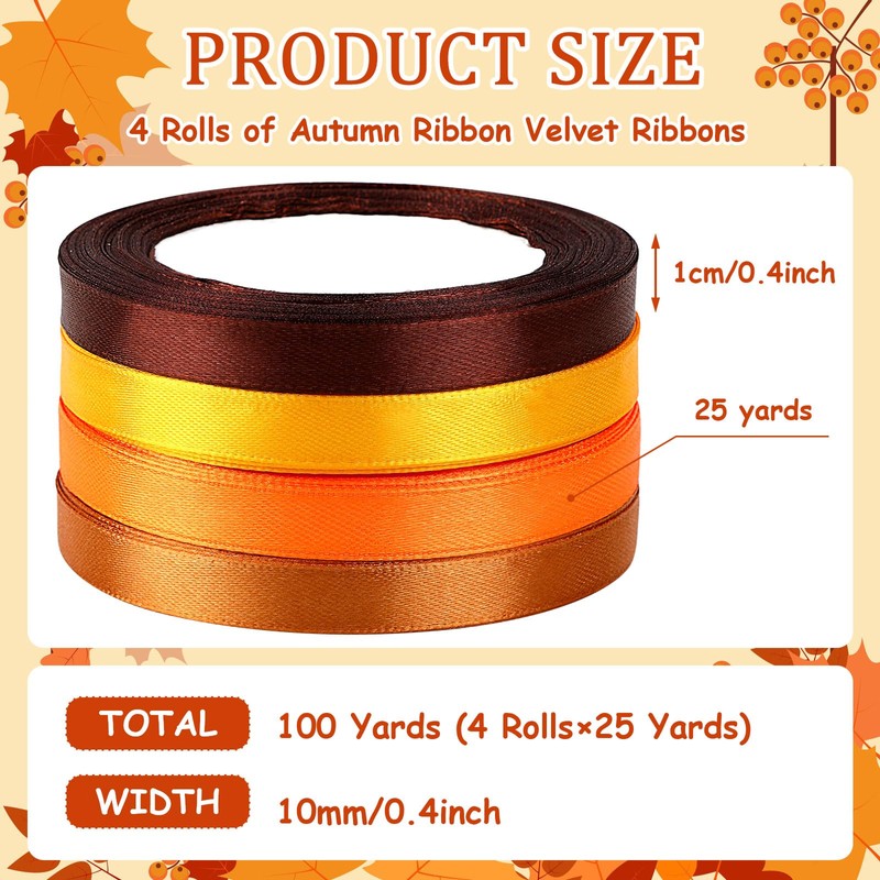 - Package Includes: You will get 4 rolls of fall ribbons in 4 colors, orange, yellow, light brown and dark brown, each color has 25 yards, a total of 100 yards. With complete colors and enough length, the fall ribbon is suitable for autumn Thanksgiving gift wrapping and decoration